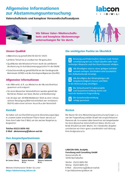 Wir bieten fachlich fundierte Abstammungsgutachten und Vaterschaftstests zur zuverlässigen Klärung familiärer Fragestellungen. Unsere Untersuchungen werden nach anerkannten wissenschaftlichen Standards durchgeführt und können sowohl zur persönlichen Orientierung als auch als gerichtsverwertbare Gutachten eingesetzt werden.